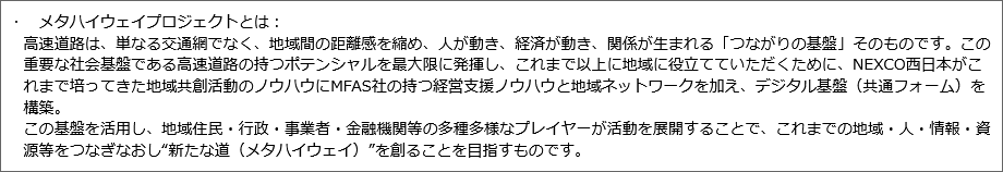 「メタハイウェイプロジェクト」は、高速道路のネットワークを活かし、地域の人・資源・情報をつなぐ“新たなデジタル基盤”を構築する取り組みです。