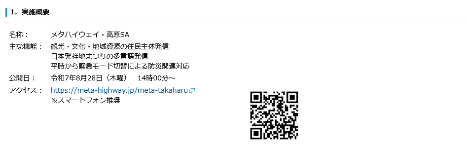 宮崎県高原町(町長:高妻 経信)、NEXCO西日本九州支社(福岡市博多区、支社長:加治英希)と、MFAS株式会社(長崎市馬町、代表取締役:永田吉朗)は、「メタハイウェイプロジェクト」の第一弾として、地域資源を住民主体で発信し、戦略から実行までをつなぐ“地域経営プラットフォーム”による新たな地域活性化施策を開始します。
