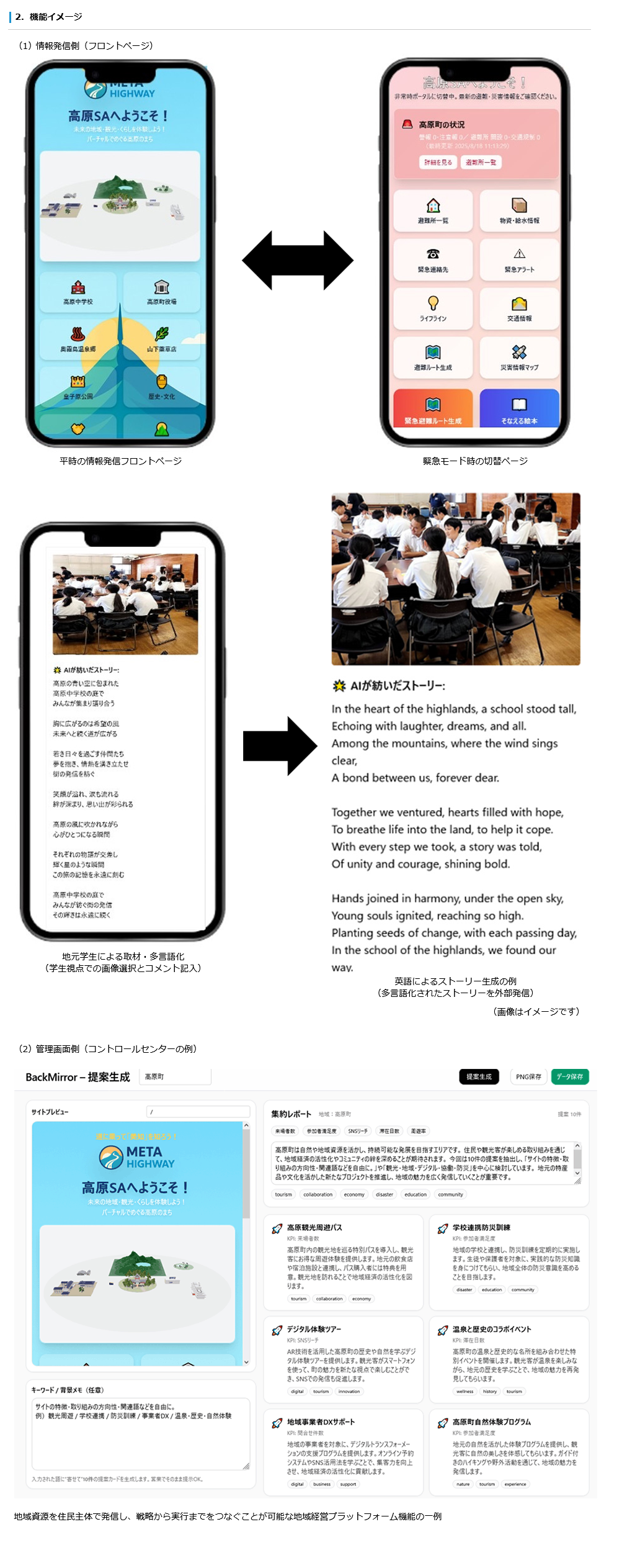 さらに施策は、単なる地域情報発信にとどまりません。例えば、地域課題を抽出し、戦略を描き、目標を設定して可視化する一連の仕組みを実装し、住民、事業者、行政が同じプラットフォームで地域活動を共有化できるようにします。さらに、セミナー配信、アンケート生成やサイト分析といったシステムも組み込み、従来は断片的だった情報や活動を、計画と実行へと活性化することを目指します。併せて、情報発信のフロントページには「緊急モード」を搭載します。平時は観光や文化情報を発信し、有事には防災ページに切り替わり、緊急情報や避難ルートに関する参考情報を表示するなど、一つのページで平時と有事をシームレスに切り替えるプラットフォームとして実装します。